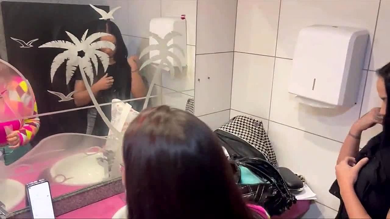 Horny wife gives a blowjob in a public restroom