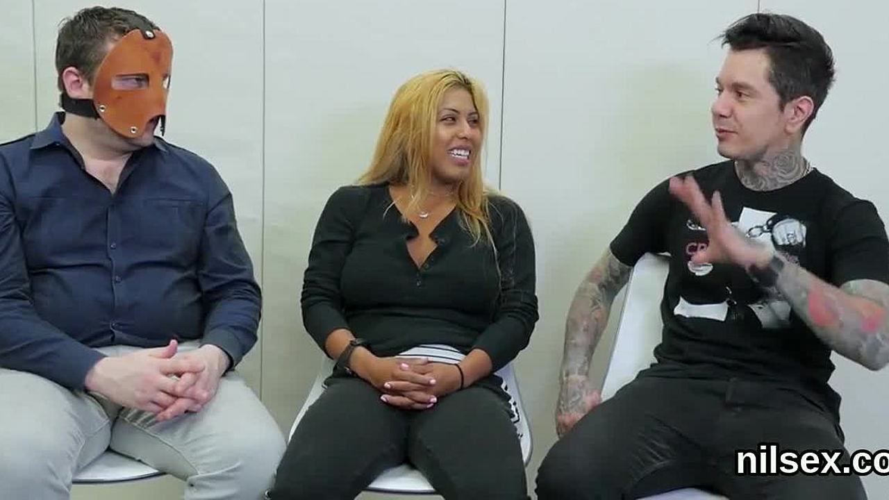 Tied ebony endures double penetration on couch with big cocks