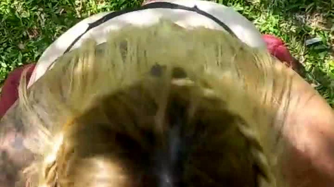 busty blonde vicky vette sucks boyfriend's big cock deepthroat outdoors then rides him wet