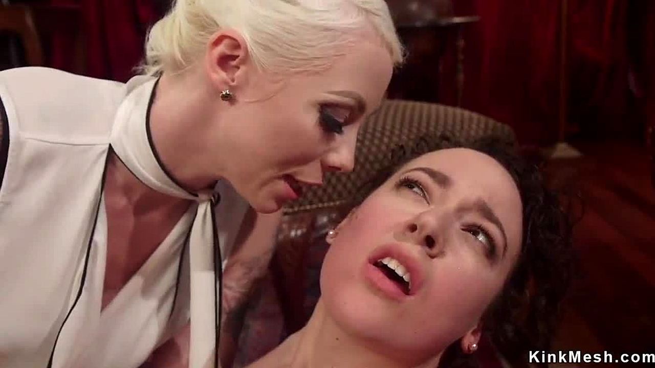 Butt plugged lesbian slave ass whipped hard in kinky BDSM session